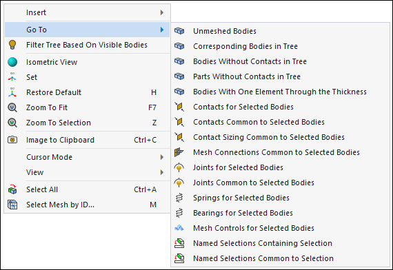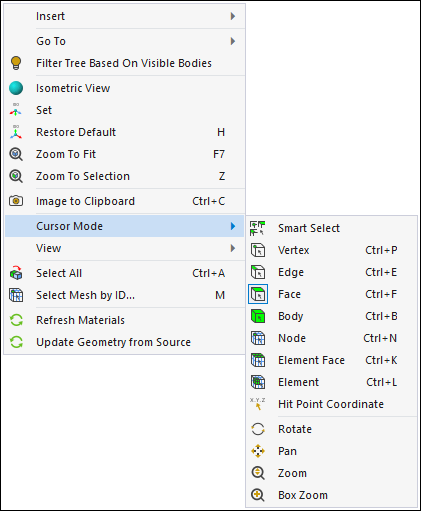 Right-clicking the mouse in the Geometry window provides a context menu with a variety of options. The common menu options and specifically, the Cursor Mode menu, are illustrated below. Furthermore, the menu displays additional options that are based on the object you have selected. For example, the Insert and Go To options shown below are often available and their menu selections depend upon the tree object that is selected.