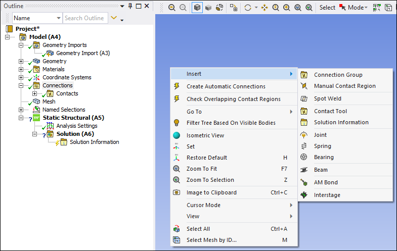 The options of the menu depend upon the object selected in the tree. For example, with the Connections object selected, right-click in the geometry window and then select to display the menu of connection options illustrated below.