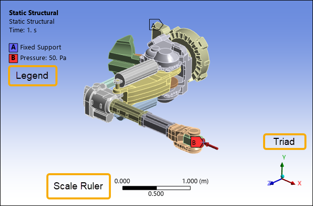 The information presented by the Legend varies, but in general, it provides information about the currently selected object or objects as well as the analysis type, and includes annotations. For the above example, a Fixed Support object is selected. The face to which the support is applied is shown via color coding.
