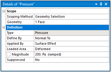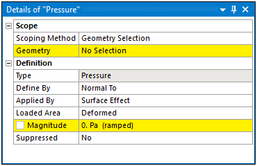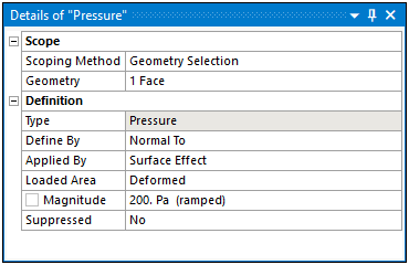 The heading of the pane identifies the name of the selected object (contained in parenthesis), such as the "Pressure" load shown here. For certain objects, the heading may also display the type of object currently selected in addition to the object name.
