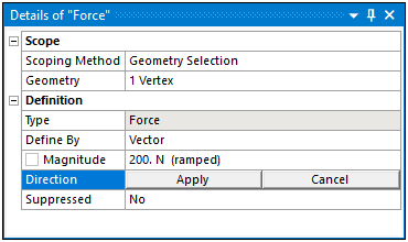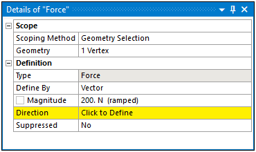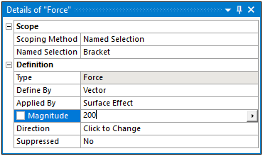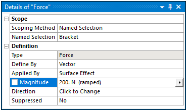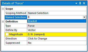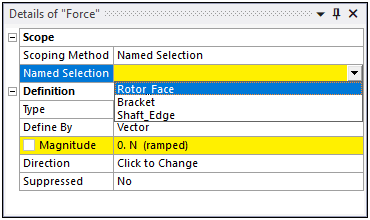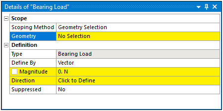 The Scoping Method and its associated properties, usually Geometry and Named Selection, may have selection requirements. For example, the application only supports face scoping for a Bearing Load. If you try to scope the load to any other geometric entity, or a Named Selection that is not face-based, the application presents an invalid state.