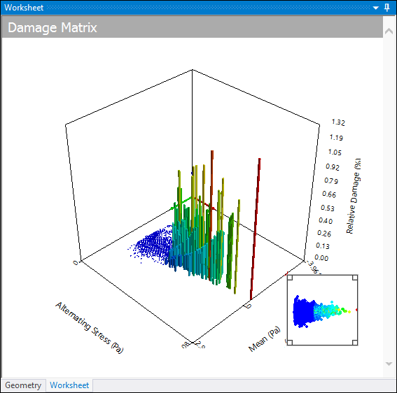 Similar to the rainflow matrix, this graph depicts how much relative damage each bin has caused. This result can give you information related to the accumulation of the total damage (such as if the damage occurred though many small stress reversals or several large ones).