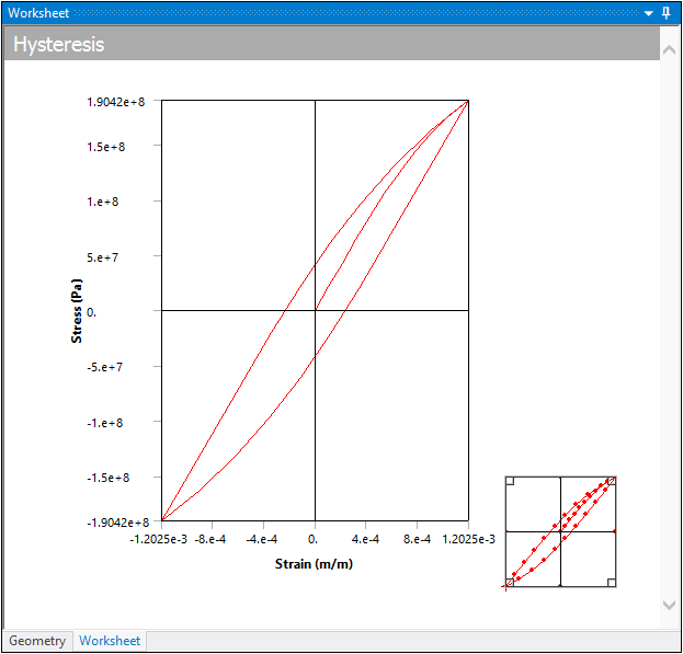 In a strain-life fatigue analysis, although the finite element response may be linear, the local elastic/plastic response may not be linear. The Neuber correction is used to determine the local elastic/plastic response given a linear elastic input. Repeated loading will form close hysteresis loops as a result of this nonlinear local response. In a constant amplitude analysis a single hysteresis loop is created although numerous loops may be created via rainflow counting in a non-constant amplitude analysis. The Hysteresis result plots the local elastic-plastic response at the critical location of the scoped result (the Hysteresis result can be scoped, similar to all result items). Hysteresis is a good result to help you understand the true local response that may not be easy to infer. Notice in the example below, that although the loading/elastic result is tensile, the local response does venture into the compressive region.