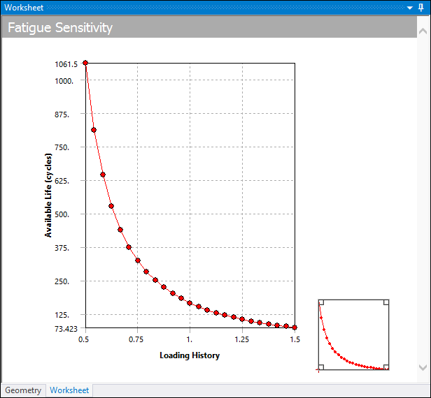 This plot shows how the fatigue results change as a function of the loading at the critical location on the scoped region. Sensitivity may be found for life, damage, or factory of safety. For instance, if you set the lower and upper fatigue sensitivity limits to 50% and 150% respectively, and your scale factor to 3, this result will plot the data points along a scale ranging from a 1.5 to a 4.5 scale factor. You can specify the number of fill points in the curve, as well as choose from several chart viewing options (such as linear or log-log).