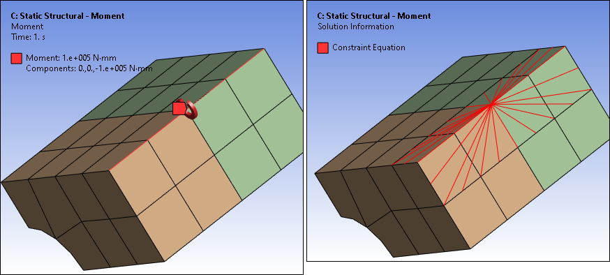 The following example shows how the application applies a Moment, scoped to a straight edge, to the neighboring element face nodes. In this example, the imbalance of constraint equations created on the blocks might result in unwanted non-zero moment reactions. You can minimize this by using either a lower order mesh or a coarser higher order mesh. For more information, see the Surface-Based Constraints section of the Mechanical APDL Contact Technology Guide.