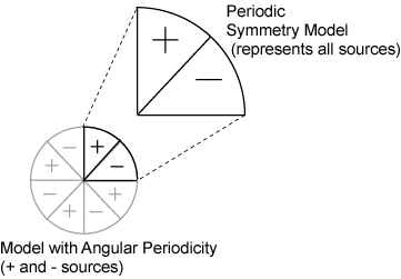A model exhibits angular periodicity when its geometry and sources occur in a periodic pattern around some point in the geometry, and the repeating portion that you are modeling represents all of the sources, as shown below (see the Periodicity Example).