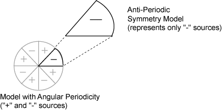 A model exhibits angular anti-periodicity when its geometry and sources occur in a periodic pattern around some point in the geometry and the repeating portion that you are modeling represents a subset of all of the sources, as shown below.