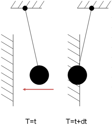 A second method of contact formulation is to detect the transition between the separated space of a given pair of bodies and the configuration where they are overlapping. The image below depicts a point mass approaching a separate wall, and the overlapping configuration following impact.