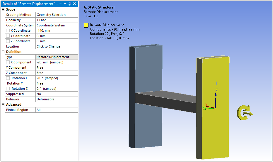 [a] For a Modal analysis, only zero magnitude Remote Displacement values are valid. These function as supports. If non-zero magnitude remote displacements are needed for a Pre-Stress Modal analysis, apply the Remote Displacement in the static structural environment.