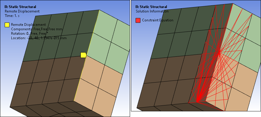 The following example shows how the application applies a Remote Displacement, scoped to a straight edge, to the neighboring element face nodes. In this example, the imbalance of constraint equations created on the blocks might result in unwanted non-zero moment reactions. You can minimize this by using either a lower order mesh or a coarser higher order mesh. For more information, see the Surface-Based Constraints section of the Mechanical APDL Contact Technology Guide.