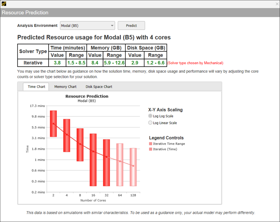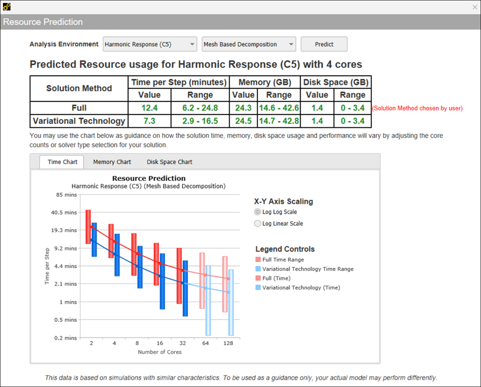 To provide better data insight with respect to the variation in core count, Resource Prediction provides a chart based on a core count from two to 128 cores. In addition, to improve data representation, each chart provides a radio button that enables you to switch between log and linear scales. Options include Log-Log (default) and Log-Linear.