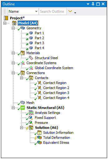 : Solve the analysis. If an object is selected at the environment level (for example, Static Structural) or below, only that particular analysis is solved. If an object above the environment level is selected, all analyses are solved.