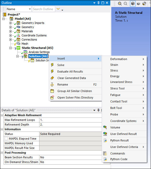 Each Outline object provides contextual (right-click) menus, as illustrated below. These menu options are generally based on the selected object. For example, if you select the Solution object, most of the menu options are specific to obtaining solution data or further defining the results of the simulation.
