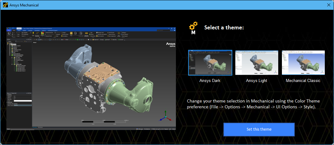 When you first install and launch the application, the following dialog displays so that you can select a theme. Options include , , and .