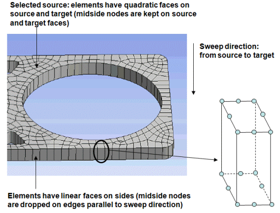 As in the example, when generating the gasket element mesh with Element Order set to Quadratic, the midside nodes are dropped on the edges that are parallel to the sweep direction.