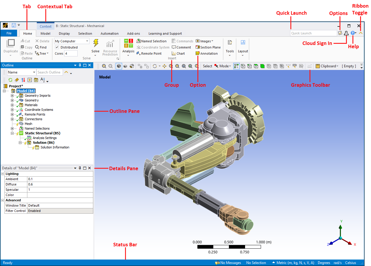The Ansys Mechanical application user interface and its main components are illustrated below.