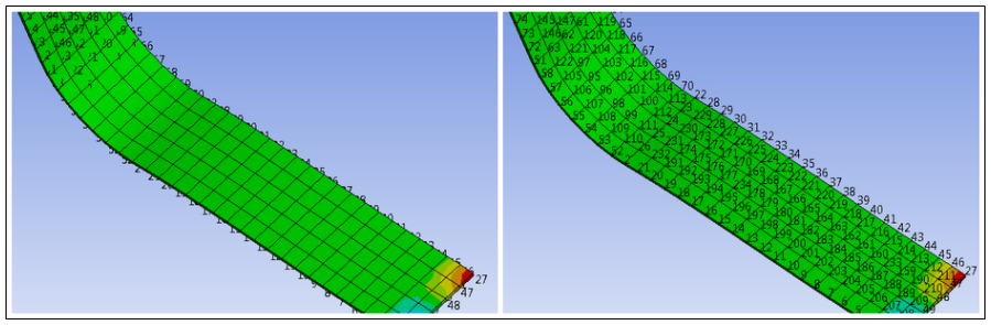 Element Numbers: Toggles the visibility of mesh element numbers in Named Selection, Mesh, and Result displays. This selection also provides options to specify a numerical range of which elements to display. Because Element Numbers are displayed at the centroid of the elements, Wireframe mode is required to properly display all Element Numbers.