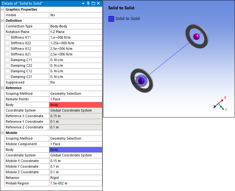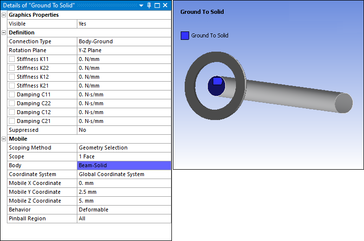 Bearing scoping is limited to a single face, single edge, single vertex, or an external remote point. Similar to a spring, there is a Mobile side and Reference side for the bearing connection. Based on the Mobile and Reference side selections, a bearing can be made as a bearing connection between Body to Ground or Body to Body.