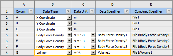 To display this information, you must first specify in the Data Type column in the External Data Setup page, set a unit system, and enter "Volume1" in the Data Identifier field. The example below illustrates the settings.