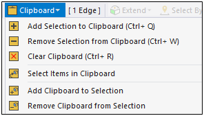 To help you keep track of what is contained in the Clipboard, once you make selections (or add or change) the Clipboard menu displays the current number of entities contained in the Clipboard, such as [1 Edge], as illustrated above. When no selections are contained in the Clipboard, this field contains the text string "Empty." Also note that the status bar displays active Geometry window selections.