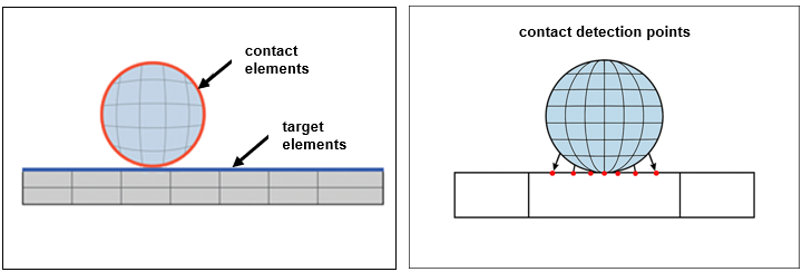 To capture the physics of this interaction, the two bodies must be assigned contact and target elements to model how forces are transferred between them. This is known as a contact pair. The following figure shows how these elements are defined. Contact elements are located on the body that moves into contact with the target body. They use detection points located at either their nodes or integration points of the mesh. Target elements are located on the body that receives contact. When contact detection points pass through the target face, it is in contact. It is open gap otherwise. You can increase the number of contact detection points by specifying a finer mesh for the contact body/surface.