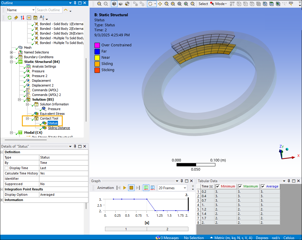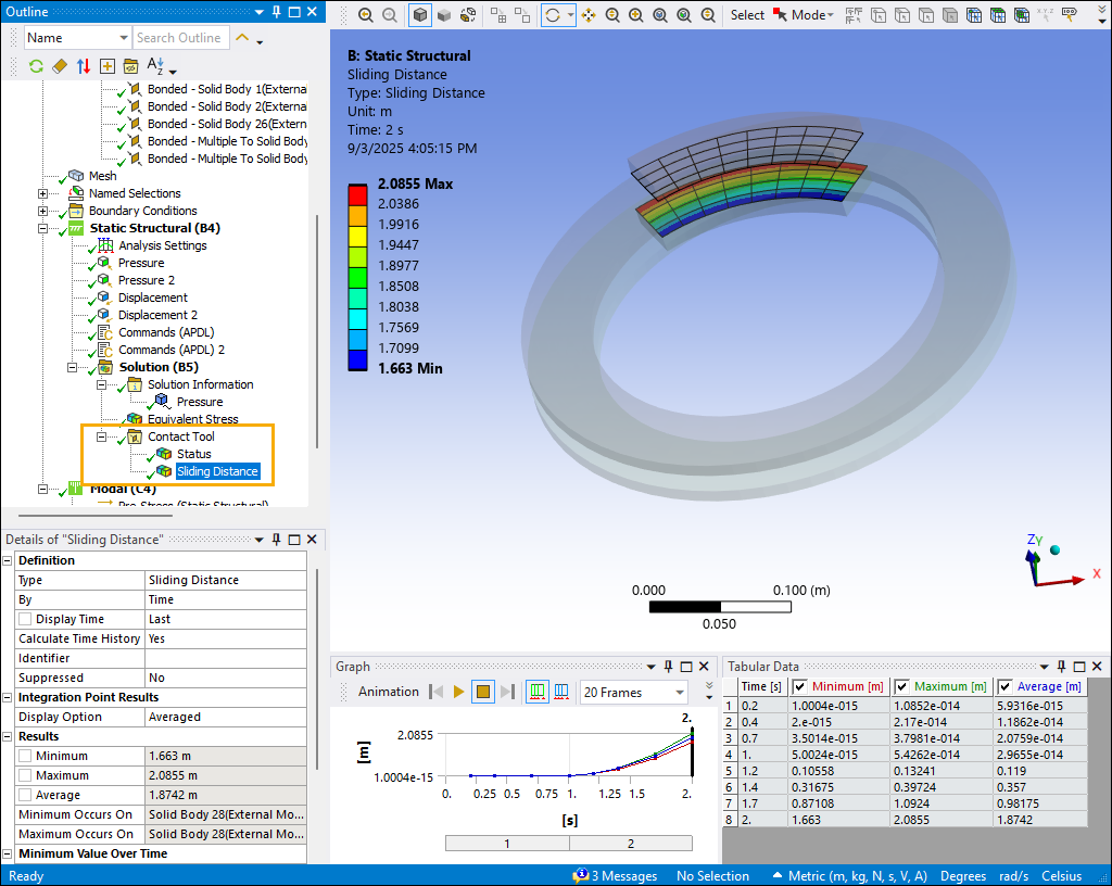 After solving, you can use the Contact Tool to plot contact results over time, including status, frictional stress, pressure, and sliding distance. Display static and animated plots for an individual contact region or for multiple regions. This lets you focus on contact regions whose results are of interest in your analysis. For example, the following Contact Tool plot shows the sliding distance for a contact region in a brake assembly. The minimum, maximum, and average sliding distance are shown in a contour plot, a table, and an animated plot of sliding distance versus time.
