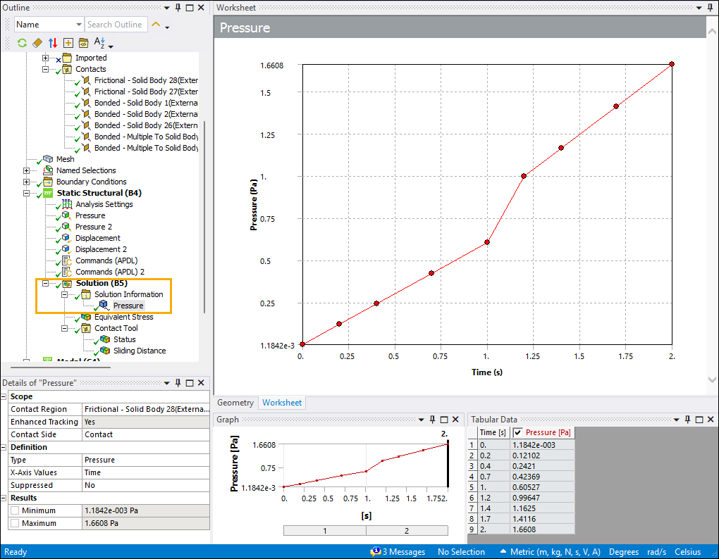 For example, the Pressure contact results tracker in the following figure (highlighted in yellow) was added to the Solution Information object after the solution was computed. The plots and tables on the right-hand side of the figure display pressure versus time at each timestep.