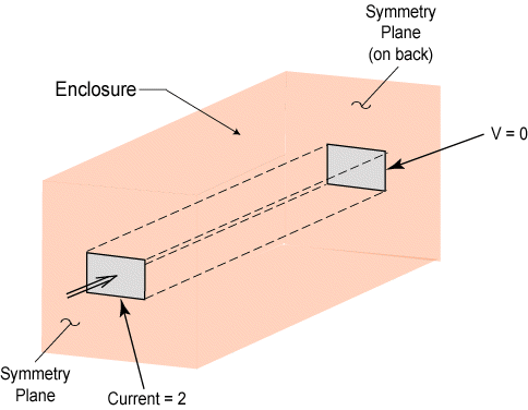 Note: Current excitations may only be applied to a face of a solid source conductor body at symmetry planes. An excitation must be accompanied by a ground potential set at another termination point of the conductor body on another symmetry plane. No current may be applied to a conductor body face that is interior to the model domain. The symmetry plane on which the current excitation is applied must also have a magnetic flux-parallel boundary condition.