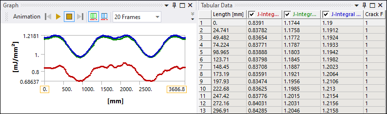 The results are plotted in the Graph window for all contours, starting from the Contour Start value and ending at the Contour End value. The X axis in the Graph window indicates the distance along the crack front. The start of the crack front has a value of zero, and the end of the crack front has the maximum value. The Tabular Data window displays the data points in a table format.