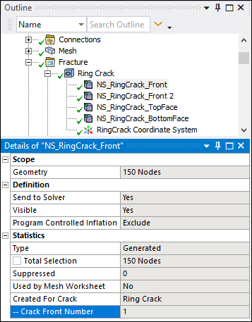 Crack Front Number: Specify the crack front(s) on which to evaluate results. Options include (default), which is equal to setting the property to zero (0) or you can enter a specific Crack Front Number (contained in the Details of the crack front named selection object) to evaluate results for that crack front only.