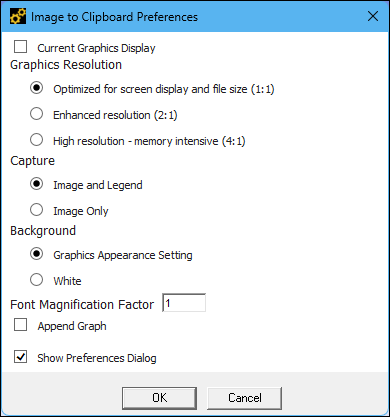| Image Export | Current Graphics Display | When exporting an image to a file using the option, this preference defines whether or not to copy the image