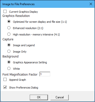 | Append Graph | Specify whether to include Graph window data on the captured image. If there is no corresponding data in the graph, the captured image includes a graph with no data. Options include and (default). When set to , the corresponding setting on the Image to File Preferences dialog is automatically selected. | |