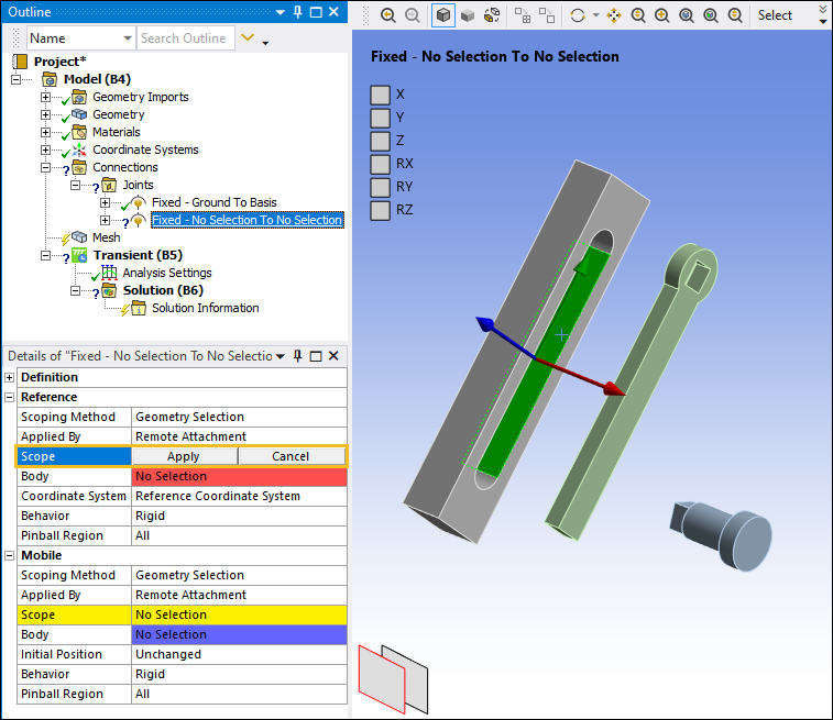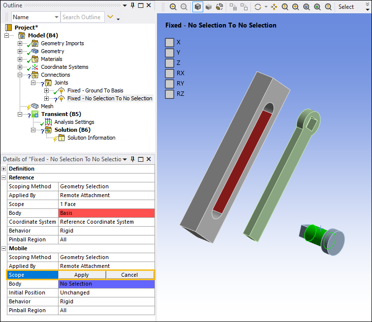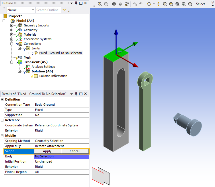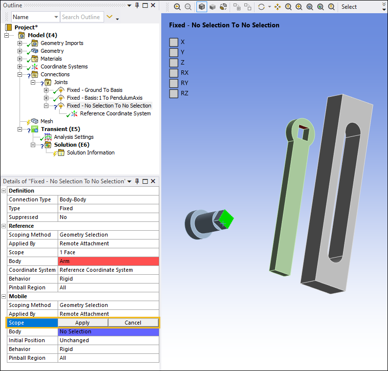 Select the cylindrical face of the PendulumAxis as shown below. In the Details pane, select the field of the Scope property under the Mobile category and then select Apply.