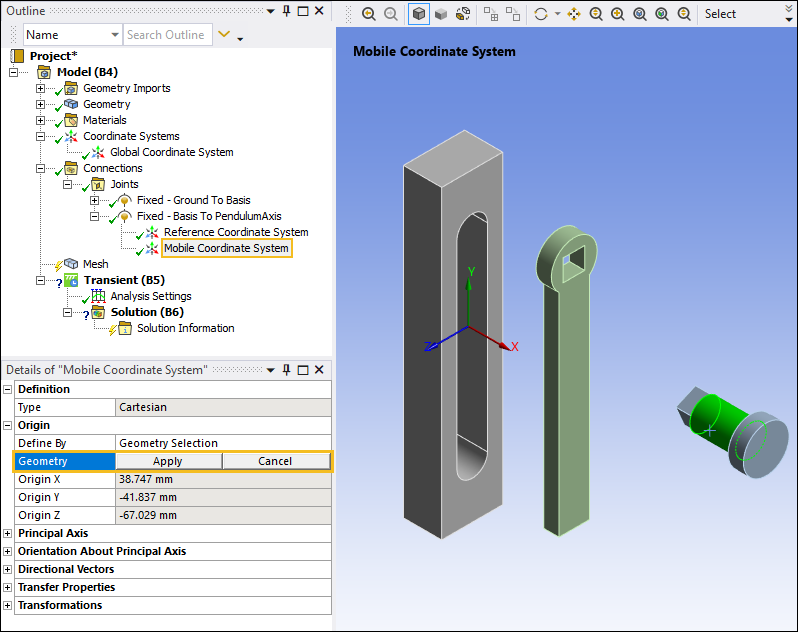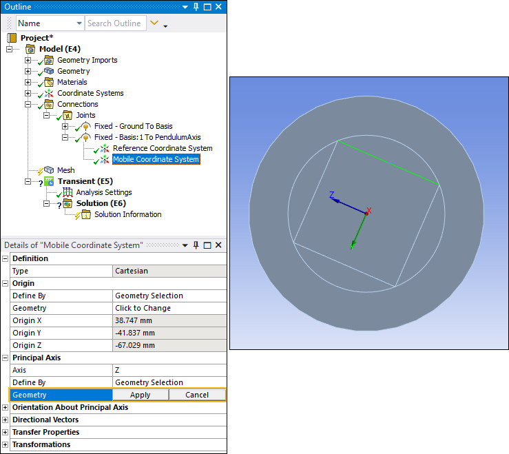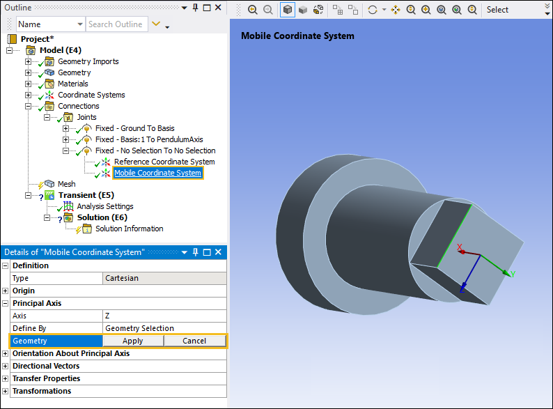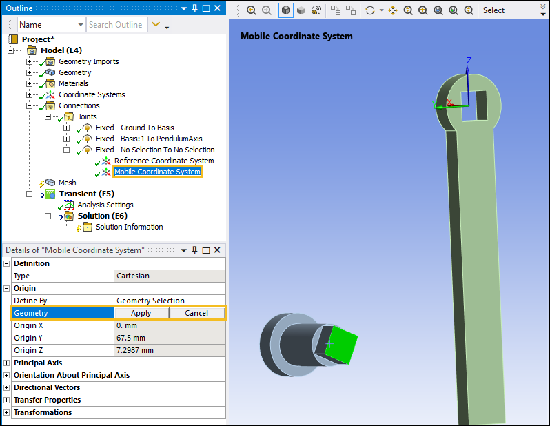 Select the Mobile Coordinate System object. This coordinate system is currently associated with the Basis body. In the Details pane, under the Origin category, select the field of the Geometry property, select the cylindrical surface on the PendulumArm body as shown below, and then click .