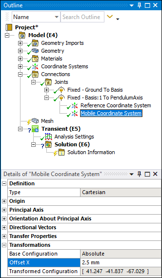 Select the Mobile Coordinate System object. Under the Principal Axis category, select the field of the Geometry property, select an edge of the PendulumAxis, and the select .