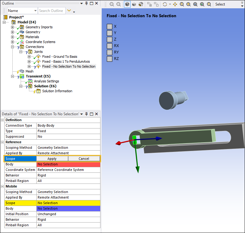Next, you need to join the PendulumAxis body to the Basis body. Since they are initially disjoint, you need to set two coordinate systems. One for each body. Additionally, to fully define the relative position and orientations of the two bodies, you must define a fixed joint between them. To do this: