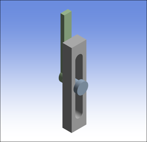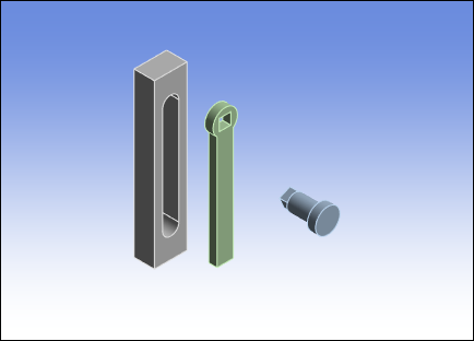 This section demonstrates the steps to assemble a geometry using a three-part a pendulum joint model. The Assemble feature enables you to assemble the different parts of a model and then "set" the assembled configuration for the start of your analysis. The geometry shown below was imported into a Rigid Dynamics analysis system.