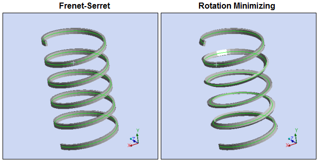 In addition to specifying the cross section type and offset, DesignModeler and Discovery also allow you to align cross sections to ensure they have the proper orientation. For more information on Frame Alignment and how to override the default alignment algorithm, see Cross Section Alignment. Illustrated below are examples of the alignment algorithm options from DesignModeler.