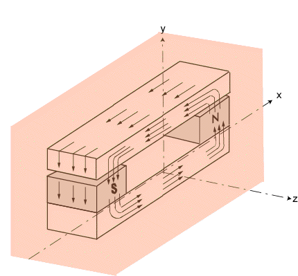 Half-symmetry model of a keepered magnet system. Note that the YZ-plane is a Flux Normal boundary. The flux arrows flow normal to the plane. This is a natural boundary condition and requires no specification.