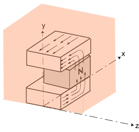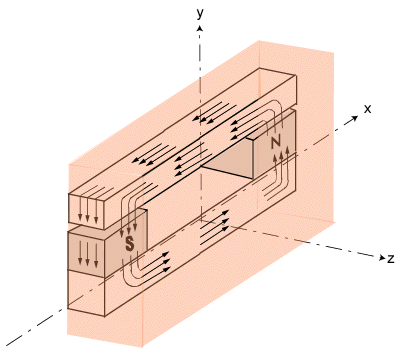 Selecting Flux Parallel forces the magnetic flux in a model to flow parallel to the selected face. In the figure below, the arrows indicate the direction of the magnetic flux. It can be seen that the flux flows parallel to the xy plane (for any z coordinate).