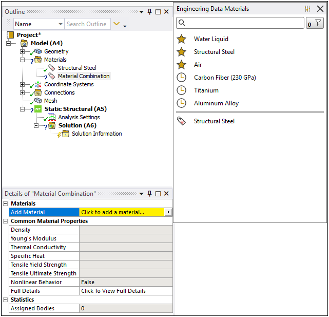 Open the flyout menu of the Add Material property to display the Engineering Data Materials pane. Using this pane, you can select from existing materials and/or search for additional materials, that you wish to combine.