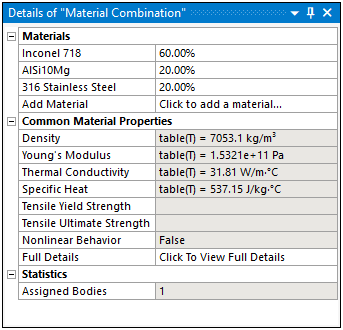 Each material property listed under the Common Material Properties category in the Details of the Material Combination object, such as Density, must include an associated temperature range. If this data is not available, the application does not specify a value. Furthermore, if the temperature values produced during the simulation go outside of the ranges for a material property, as specified in the Engineering Data workspace, the application treats these temperature values as a constant value.