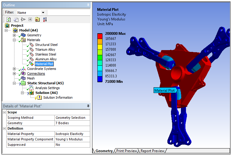The Material Plot feature enables you to plot the materials of your model as contours using geometry or Named Selection scoping. The supported geometric entities include Body, Face, Edge, and Element. Once you specify your geometry selections, right-click the object and select . The Geometry window displays contours on your model that correspond to the material (properties) of the specified geometry/geometries/named selections. An example is illustrated below that includes Isotropic Elasticity, Young's Modulus, and the unit of measure.