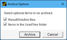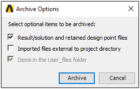 Generates a single archive file that contains project files. During the archive process, the application prompts you with the following dialog to make optional selections. ![]() ![]() These options enable you to control whether the archive includes certain data. This can be helpful if you have file size concerns. Supported file types include Mechanical (.mechpz), Workbench Project Archive (.wbpz) or Zip (.zip/.tar.gz). You can also perform this action in Workbench. See the Archiving Projects section for more information. | ||||||