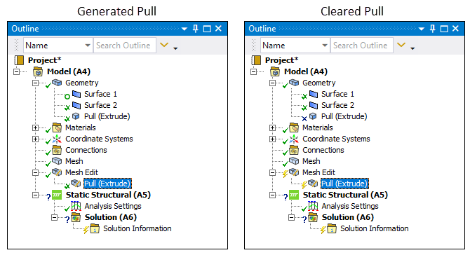 When you have defined the desired type of pull, you select the context (right-click) menu option . This action creates the mesh of the corresponding extrude/revolve/coating. This action also creates a corresponding body, based on the pull type, under the Geometry object. You can then use this body as you would use any body for your analysis, however, because it was generated from mesh data, certain limitations exist. For example, if you encounter a scoping issue, try using mesh-based scoping, such as Element Face selection, to address such issues. See the Limitations topic below for more information.