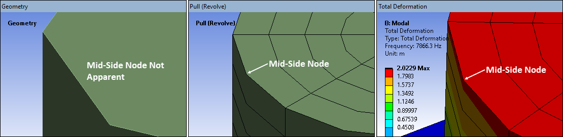 There is currently a display limitation for bodies generated using the > feature for higher order elements. You may notice when viewing a Pull Revolve generated body that it's geometric outlines does not appear to pass through the mid-side nodes of the generated mesh. This is a display issue and does not affect your results as illustrated below.