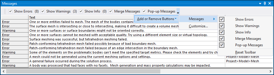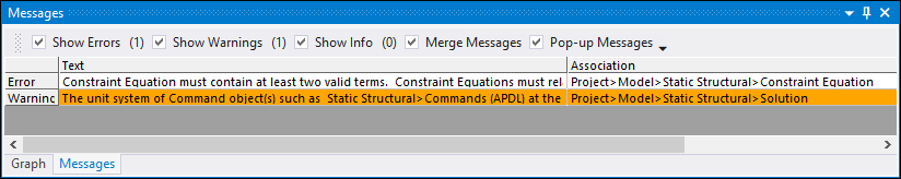 The Messages Window is a Mechanical application feature that prompts you with feedback concerning the outcome of the actions you have taken in the application. For example, Messages display when you resume a database, Mesh a model, or when you initiate a Solve.