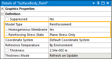 For 3D Structural analyses, when the Homogeneous Membrane property is set to , the additional property Reinforcing Stress State displays. This property enables you to specify the reinforcing stress state and stiffness behavior of the homogeneous reinforcing layer (membrane). Options include (default), , and . See the Reinforcing topic in the SECCONTROL section of the Mechanical APDL Command Reference for more information.