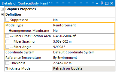 If Homogeneous Membrane property is set to , then the Surface Body is treated as a reinforcing layer with a cluster of parallel and equidistant fibers having the same cross section. This means that the layer has a uniaxial-stress state in the direction of the fibers. The value in the Thickness property is ignored. The following additional properties display and require specification: