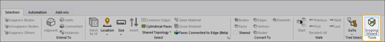The Scoping Wizard option is available on the Selection tab of the ribbon. This feature automatically detects any geometry-based scoping that becomes lost following a geometry update. Once identified, you use the options of the feature to visualize and reestablish the original scoping. You turn the feature on (default) and off using the Use Geometry Based Associativity preference (Options > Geometry) dialog. In addition to the activation preference, there is an associated preference (Automatic Scoping Update) to have the application automatically correct geometry-based scoping that becomes lost following a geometry update.
